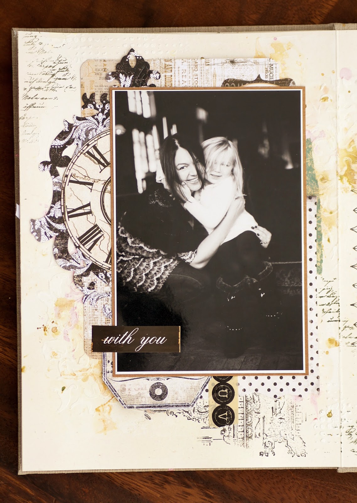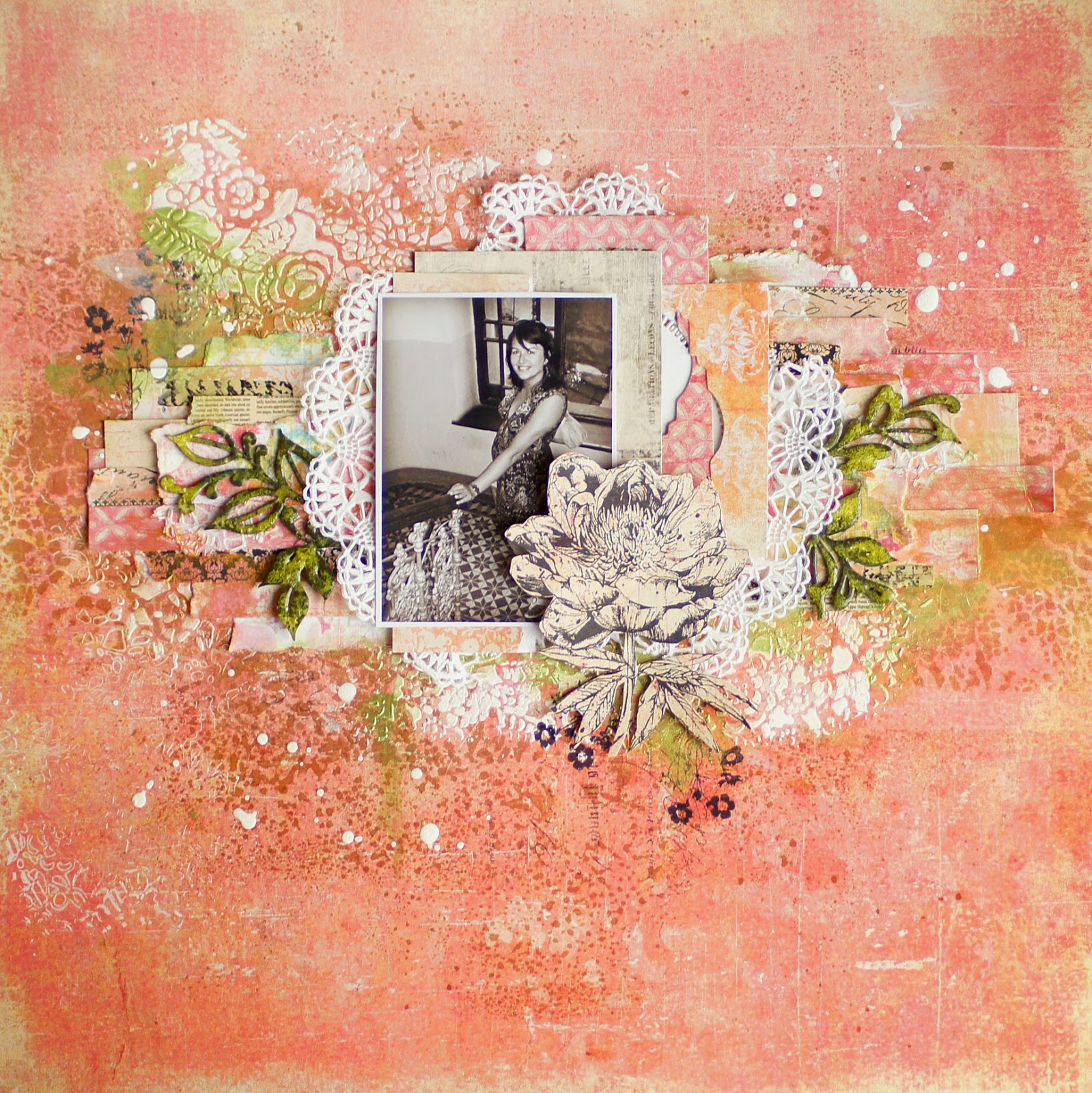 I started by creating the stencil pattern in the bottom part of the paper. I used Floral stencil and gesso to create some round patterns, following the sketch. Then I added a bit of colour with watercolours to get more dimension. I finished off the background with some stamping and splatters of black ink. For the matting under the photos, I used pieces of papers from the Love Letter kit and Sunrise Sunset. I also added some round embellishments, corresponding to the round patterns in the lower part of the sketch.